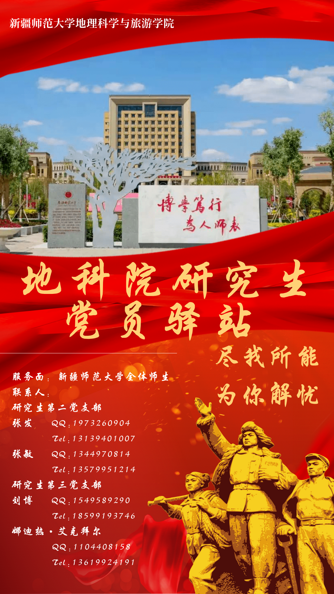 本着“全心全意为师生服务,踏踏实实树党员形象的宗旨,现taptap点点研究生第二党支部和第三党支部整合力量,建立地科院研究生党员驿站,为校内外有需要的师生提供力所能及的帮助。无论是师弟师妹需要了解咨询专业经验;还是校外校友因疫情不便,需委托校内同志帮忙办事;再或者……。在非盈利的前提下,我们经了解后尽可能的为您提供力所能及的帮助。如您需要帮助,可以联系海报中的联络员,我们的目标是:尽我所能,为你解忧。