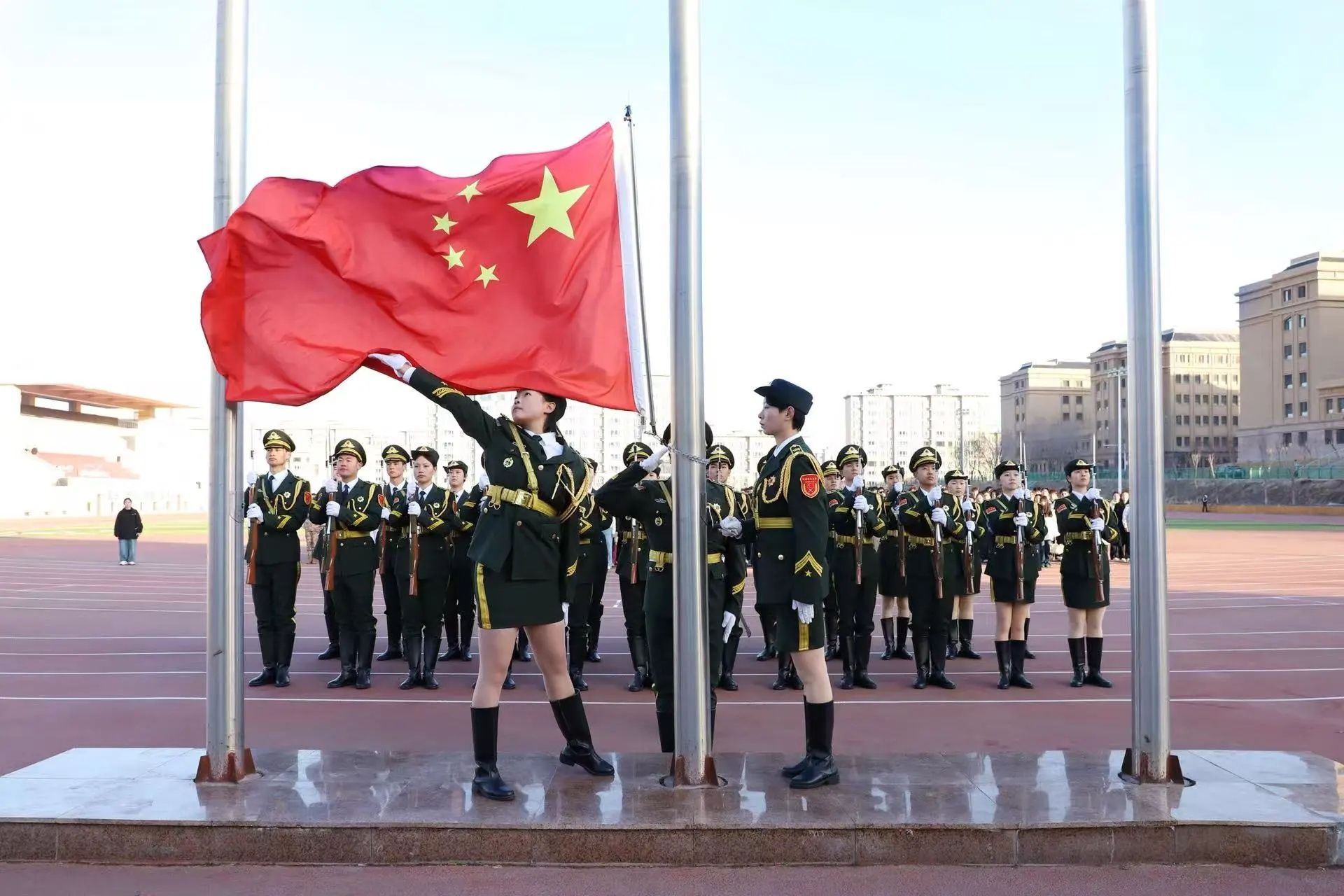 迎着晨光,升旗仪式正式开始。国旗护卫队迈着铿锵有力的步伐,护送五星红旗走向升旗台。在庄严的《义勇军进行曲》中,鲜艳的五星红旗冉冉升起,全体师生肃立行注目礼,心中涌动着对伟大祖国的无限崇敬与热爱,现场氛围庄重而肃穆。
